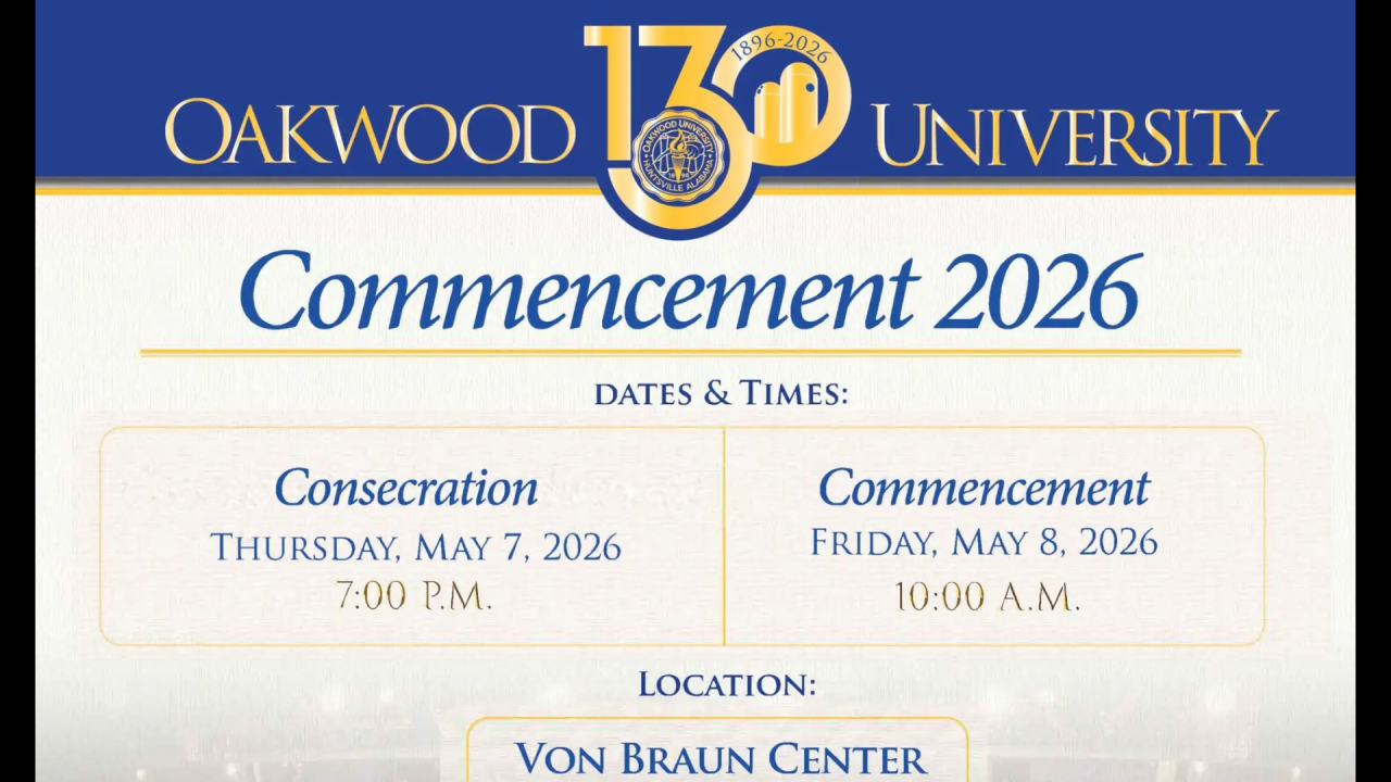 Oakwood University Graduation 5/7/2026, 5/8/2026 Propst Arena SHOWTIME(S)Thursday, May 7, 2026 at 7:00 p.m.Friday, May 8, 2026 at 10:00 a.m. TICKETSNo Ticket Required