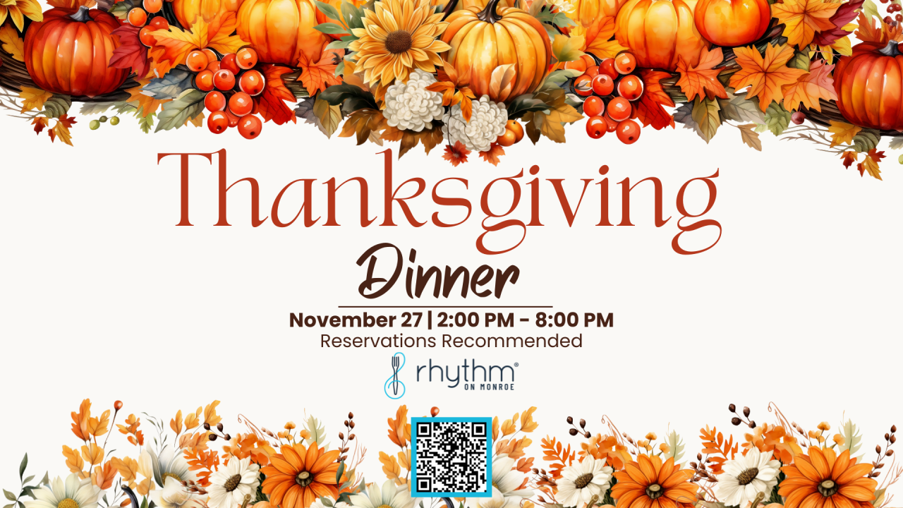 Celebrate Thanksgiving in style with a festive feast at Rhythm On Monroe! Join us on Thursday, November 27, from 2:00–8:00 p.m., for our annual Thanksgiving Dinner — featuring a special holiday menu filled with all your favorite classics (and a few chef-inspired twists!).