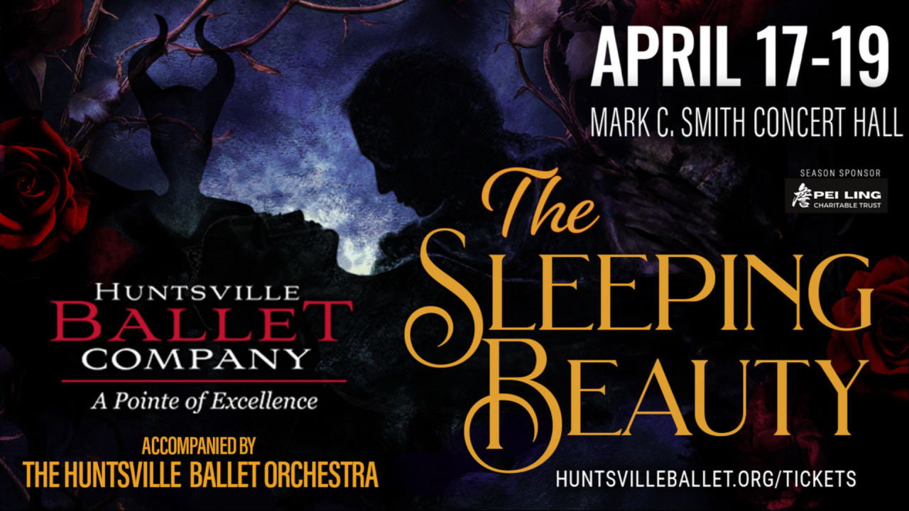 The Huntsville Ballet Company takes the stage of the Mark C. Smith Concert Hall once again in April to close its 62nd season with the spellbinding classical fairytale ballet The Sleeping Beauty. The Sleeping Beauty tells the story of Princess Aurora, cursed in her infancy by the Fairy of Darkness to die on her sixteenth birthday from pricking her finger on a spindle. The Lilac Fairy intercedes to lessen the curse to a sleeping spell of 100 years, breakable only by a true love's kiss. This classical fairytale ballet incorporates enchantment, suspense, and passion set to Peter Tchaikovsky's iconic score.